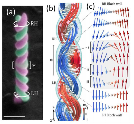 (a) Double-helix with opposite chirality (bottom LH: left-handed; top RH: right-handed) interfaced at the region marked by an asterisk. Scale bar is 1 µm. (b,c) Micromagnetic simulations of the double-helix system in an antiparallel magnetic state; a Bloch wall with a well-defined chirality is formed between the strands, with the chirality defined by the chirality of the corresponding helix. A 3D vortex with a Néel defect is formed at the region (*) connecting both chiralities. Reproduced with permission from [98]. Copyright 2020 American Chemical Society.