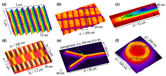 Atomic force microscopy images of exemplary FEBID structures for fluxonics and magnonics. (a) Nb film decorated with an array of asymmetrically shaped Co nanostripes inducing a ratchet pinning potential landscape of the washboard type for Abrikosov vortices. (b) Bi-periodic magnonic crystal on the surface of a Py film that allows for reprogramming the band structure in the magnon frequency spectrum. (c) Magnonic waveguide with a gradually decreasing thickness that induces a graded refractive index for spin waves via the magnetization gradient. (d) 3D magnonic crystal in which the thickness modulation period is a factor of two larger than the width modulation period. (e) Y-shaped magnonic waveguide with a nanogroove milled by focused ion beam (FIB) at the junction for frequency-selective steering of spin waves via the refraction and reflection effects. (f) “Nano-volcano” for ferromagnetic resonance studies. Structures (b–f) are fabricated from Co3Fe employing the precursor HFeCo3(CO)12.