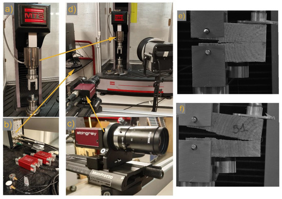 Experimental setup used to conduct the splitting tests on the pine and oak simil-CT samples. (a) Universal testing machine (UTM) (MTS producer) with the specially created grippers securing the samples as in (e,f); (b) AE system with the pre-amplifiers and the piezoelectric VS900-M sensors; (c) F504B Stingray digital camera synchronized with the UTM; (d) Overview of the experimental setup explained in (a–c). (e) Specimen S2.1P; (f) Specimen S1.1O, both with AE sensors, i.e., on the top of the specimens the Glazer sensor in its holder, and on the bottom of the specimens, the Vallen VS900-M sensor. Names of the samples as reported in Table 1.