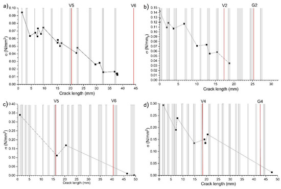 Crack length (mm)/σ (N/mm2) curves obtained for 4 of the tested samples. (a) STP1; (b) SP2.2; (c) STO1; (d) SO1.1. Red lines designate the position of the AE sensors. V, Vallen; G, Glaser. Grey areas represent the thickness of tree rings (dark areas).