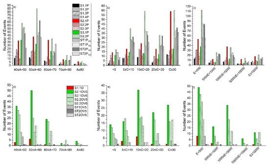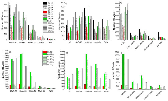 The ductile-like state, in the analyzed samples, was studied after grouping the AE events emitted during the sequence of load increase only. The database representative for these types of events was analyzed looking at the following: (1) the distribution of the characteristic parameters of amplitude, energy, and counts within the five sorter ranges on the x-axes shown in Figure 4 and (2) the frequency spectrum in terms of peak of frequency and center of gravity, shown in Figure 5.