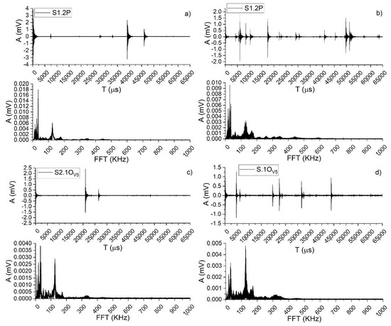 Frequency characteristics of AE features from samples S1.2P (a,b) and S2.1OV5 (c,d). (a) Top, waveform of a signal collected during the brittle state on S1.2P and bottom, FFT of the above AE signal; (b) Top, waveform of a signal collected during the ductile state on S1.2P and bottom, FFT of the above AE signal; (c) Top, waveform of a signal collected during the brittle state on S2.1OV5 and bottom, FFT of the above AE signal; (d) Top, waveform of a signal collected during the ductile state on S2.1OV5 and bottom, FFT of the above AE signal.