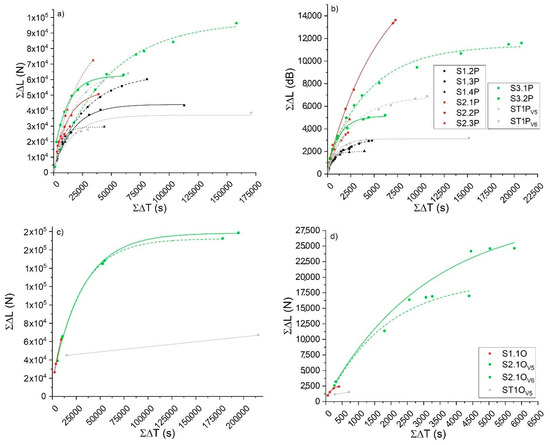 ΣΔT (s) vs. ΣΔL (N) plots of the tested samples and obtained best fits. (a) Pine, load increase; (b) Pine, load decrease; (c) Oak, load increase; (d) Oak, load decrease.