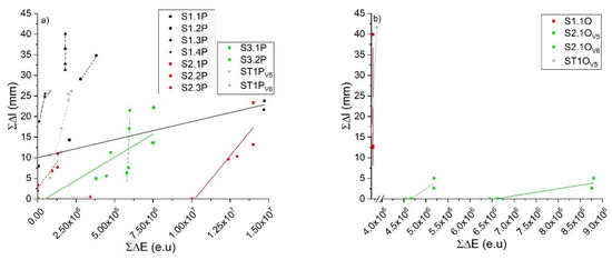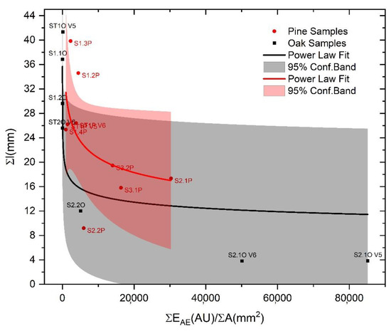 The calibration curve is a best fit equation which allows AE data interpretation with respect to the extent of fracture in the sample; in this case, the primary metric is the sum of AE energy (A.U.), to be correlated with the total crack length propagation measured using a separate technique (i.e., a camera). The BL state calibration curves are visualized in Figure 8 for the treated and untreated pine (Figure 8a) and oak samples (Figure 8b). The difference between the values obtained through the analysis of the collected images and those calculated using the calibration curves was estimated as ratio (i.e., Equation (5)) (reported in Table 3):