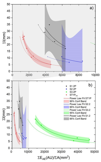 Table 4 reports all the BL calibration curves, an objective of this work, that are meaningful fits to estimate crack propagation from AE energy data detected during laboratory tests or structural health monitoring campaigns. In fitting these curves for the load decrease stages, the first point was not considered as suggested by [32] because of the effect of the loading machine and the specimen geometry. All these fits show the linear relation that exists between the maximum energy released and the maximum distance moved by the crack through load jumps. The linear fits have a 0.78 < R2 < 0.99 which reflects the possibility to achieve FR values close to or lower than 1. The physical interpretation of these calibration curves is that they represent the energy values required to form the new cracked surfaces and to deform the surface layers as the crack propagates. Table 4 also reports the maximum AE detected energy, the maximum fractured area calculated using the BL calibration equations, and the ratio of the sum of AE energy (ΣEAE) over the maximum fractured area as calculated by the collected images (ΣA). This ratio can be interpreted as a “dynamic surface energy value” (DSV) (Equation (6)) as:
