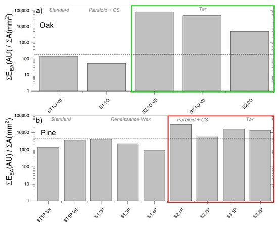 Total DSV (i.e., the ratio between the sum of AE energy (ΣEAE) over the maximum fractured area (ΣA)) for the tested samples. (a) From left to right, standard, CS + Paraloid and tar oak samples; (b) From left to right, standard, Renaissance wax, CS + Paraloid, and tar pine samples. Green boxes, samples subjected to high constraint (HC) by tar coating and red boxes, samples that showed macro damage during a previous acclimatization period.