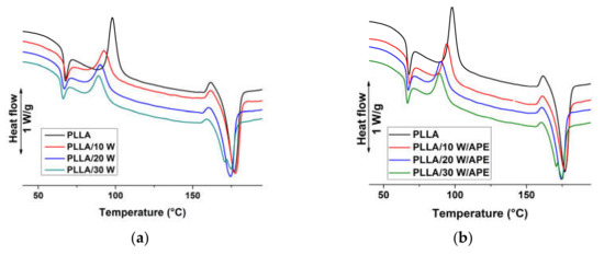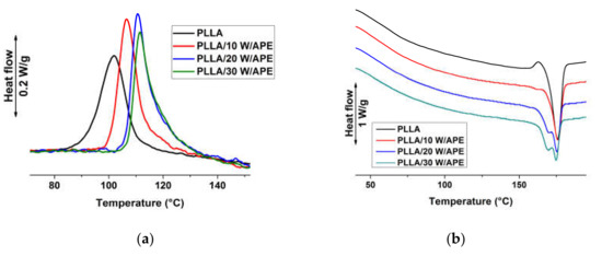 Heat flow rate plots of PLLA and PLLA/wood composites of the indicated compositions upon heating at 10 K/min. (a): PLLA/wood composites and (b): PLLA/wood/APE composites. Exotherm upward.