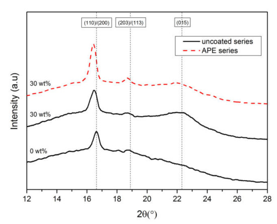Analysis of WAXD patterns allowed us to calculate the crystal fraction of PLLA and of the composites, using Equation (1), with data shown in Table 2. Crystallinity values determined by WAXD are in good agreement with those determined by the DSC plots of Figure 1, despite a precise calculation by the integration of DSC exothermic and endothermic peaks is complicated by phase transitions of α’- to α-crystals, whose melting and crystallization enthalpy are largely different [70]. Crystallinity degree values were normalized to PLLA content. Pure PLLA reveals Χc = 5%. Addition of uncoated wood causes a gradual increase in this value up to 12% for PLLA/30 W, whereas in the case of the compatibilized series this rise is slightly more pronounced resulting in a value of 14% for the highest wood concentration, with the small differences close to experimental uncertainty. The increased crystal fraction in the composites, compared to the plain polymer, confirms nucleation efficiency of the filler, as also seen by the DSC analysis.