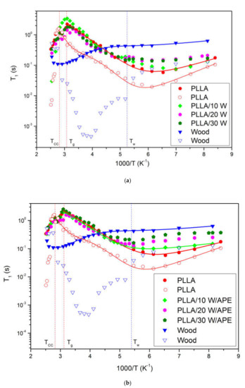 The introduction of uncoated wood into PLLA caused changes in the dynamics of the investigated composites when compared to pure PLLA. In addition, the occurrence of three components of relaxation times for the PLLA/30 W sample proved poor compatibility between PLLA and the filler. The addition of non-modified wood accelerates crystallization of the PLLA chains when compared to neat PLLA as confirmed by longer relaxation times and lower activation energies [88]. The NMR results confirmed that using γ-aminopropyltriethoxysilane (APE) as a surface modifier improves interfacial adhesion between wood filler and PLLA. It is assumed that the reactive amino NH2 groups of APE interact strongly with PLLA chains, due to their capability of hydrogen bonding with PLLA. Modified wood through strong hydrogen bonds with PLLA chains influences molecular dynamics of PLLA chains. An increase in the activation energy Ea, both for motions of CH3 groups and local polymer chains, can be explained by restricted molecular mobility in composites with the coupling agent [89,90,91].