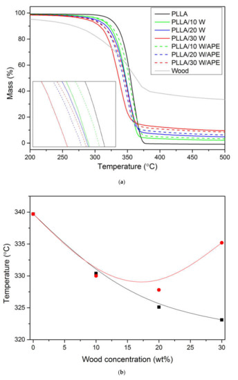 Thermal stability of PLLA and wood-reinforced composites was determined using thermogravimetry analysis (TGA). Raw TGA curves were collected upon heating at 10 K min−1 and presented in Figure 5. All the tested samples revealed a single weight loss step. Pure PLLA thermogram exhibited no significant weight loss until approximately 340 °C. The major degradation step was finalized at 374 °C, where no residue remained. The mechanism of PLLA thermal degradation implies scission of two linkages: carbonyl carbon-oxygen and the carbonyl carbon–carbon linkage [92]. Decomposition of wood, instead, starts with the loss of hemicellulose and cellulose, followed by lignin [93]. All these processes overlap in the analyzed composites, resulting in a single step degradation shifted towards lower temperatures in comparison with neat PLLA. In the case of PLLA/wood composites, a gradual decrease of the onset temperature (To) as a function of wood content can be noticed. The lower thermal stability of the composites was expected, taking into account that wood has a lower thermal stability in comparison to PLLA, as also seen in Figure 5 [94]. Degradation of the APE-compatibilized composites starts at higher temperatures compared to non-compatibilized counterparts, probing their higher thermal stability (Figure 5b). Compatibilization causes an increase in the dissociation energy needed for scission of newly created chemical bonds, which results in enhanced thermal stability of the APE-based formulations. In addition, it favors dispersion of the filler, which enhances thermal stability of the entire system [95].