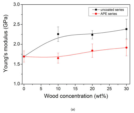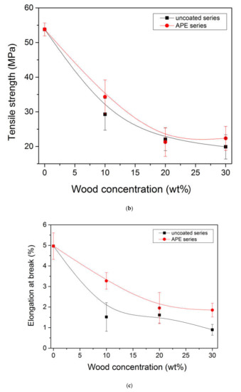 Mechanical properties of PLLA/wood and PLLA/wood/APE composites are presented in Figure 7a–d. Figure 7a–c represents tensile properties of PLLA formulations. All PLLA-based composites exhibited brittle fracture, in agreement with literature data [3,4]. Pure PLLA revealed an elongation at break of 5% and Young’s modulus of 1.7 GPa. Upon addition of uncoated wood, stiffening of the system was evidenced by increased Young’s modulus and decreased elongation at break values. In the case of the PLLA/wood/APE samples, the elastic modulus was lower comparing with the PLLA/wood composite, indicating somehow a lubrication effect of the APE layers, created on the surface between wood particles and the polymeric matrix. The tensile modulus, which is measured at very low elongations, utilizes a lower physical interaction appearing between the polymeric matrix and wood filler due to the presence of the APE layer. This phenomenon may lead to easier displacement of these two phases in the initial phase of elongation and should be taken into consideration. The varied trend of modulus with composition may also confirm an improved dispersion of the filler, promoted by APE coating of pine wood particles.