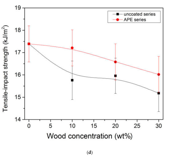 The tensile impact strength results, presented in Figure 7d, revealed a decreasing tendency, from 17.5 down to 15 kJ/m2 for all the filled composites together with wood content, as frequently observed for the composites of thermoplastic matrix and particles with dimensions comparable as in our case. Bonding in such systems is limited, hence the addition of uncoated wood particles induces the formation of voids at the wood/polymer boundary, which in turn causes the composite to crack easier under external stresses [1,16]. Worth noting is the fact that PLLA/wood/APE composites revealed somehow higher impact strength in comparison with non-modified series, hence the system is more resistant to dynamic external loads.