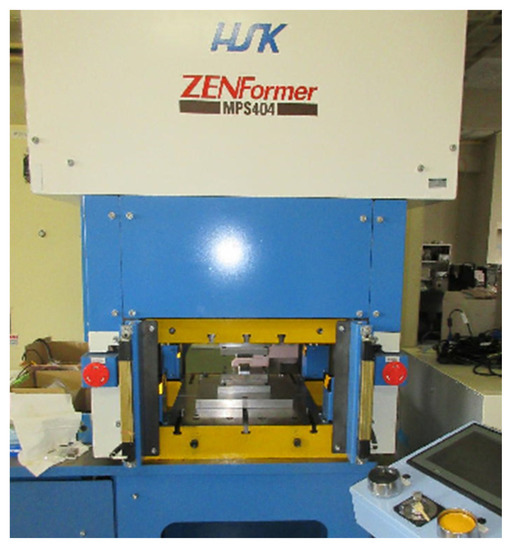 These SiC-coated SiC punch and core die were fixed into the upper and lower die sets, respectively, as shown in Figure 2. This die set was cemented to upper and lower bolsters of a CNC stamping system (MPS404 Zen-Former, HSK, Yokohama, Japan). Figure 3 depicts the CNC stamper with four motor-driving units, where each unit works independently to adjust the eccentricity in loading. Among several candidate programs, the stroke was lowered in a constant velocity of 0.1 mm/s down to the specified minimum stroke (δm), held for 1 s and then moved up to the original position at the same velocity. This δm was varied for each reduction in wire diameter. No interface delamination occurred before or after cold forging. To be discussed later, the estimated maximum forging stress in local is 10 GPa, lower than the compressive strength of 30 GPa for SiC coating.