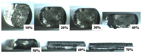 When using the SKD11 punch and core die, the bulging process dominates this upsetting behavior of the titanium wire because of significant friction on the contact interface. As seen in both Figure 4 and Figure 5, no significant bulging of wire was seen in its cross-section and plane view. This implies that monotonous flattening is driven by uniform plastic flow velocity of wire in the lateral direction and that the friction coefficient on the contact interface is greatly reduced when using the SiC-coated punch and core-die. After [13], the friction coefficient is estimated to be 0.1 to 0.2 from small bulging ratio in Figure 4 and Figure 5. When r > 20% in Figure 5, the fresh surfaces are detected as a metallic shining part at the center of forged specimen by optical microscopy observation.