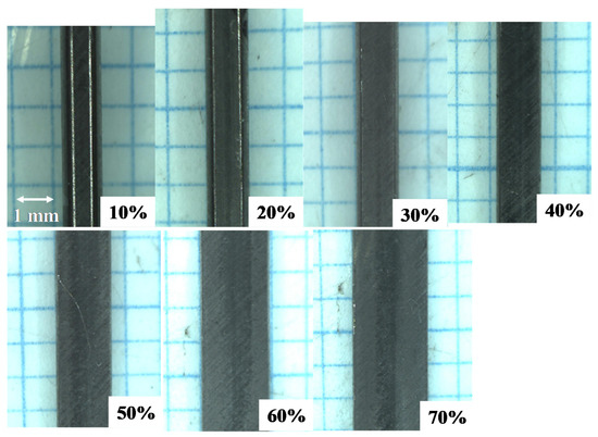 Figure 4 depicts the variation of the titanium work cross-section from a circular wire with a diameter of 0.98 mm to a flat plate with a thickness of 0.3 mm and width of 2.3 mm by increasing the reduction in thickness (r) by up to 70%. A circular wire is first compressed to deform it elasto-plastically in the axial direction and is continuously upset during a reduction in thickness of more than 20%. This change in deformation mode from the axial compression to the flattening process is also understood by observation on the plain view of forged wire. Figure 5 shows the variation of plain view of forged titanium wires with increasing the reduction. Up to r = 10%, the axial compression takes place together with flattening along the contact interface. In reductions further than 10%, the flattening of wire mainly drives this cold forging. The reduction in wire thickness results in the broadening of wire in the lateral direction.
