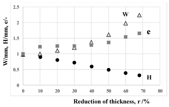 Variation of the titenium wire thickness (H), the width (W) and the surface aea extension rate (e) with increasing the reduction of thickness.