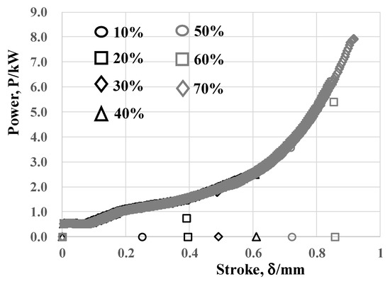 Variation of the applied power with increasing the stroke in cold forging was in situ measured up to each specified reduction in thickness by 10%, 20%, 30%, 40%, 50%, 60% and 70%. These relations are plotted into the power-to-stroke relationship in Figure 7. Each measured relation between the power (P) and the stroke (δ) for δ < δm superposes on each other to be edited into a single master curve. This single power–stroke relationship represents for the elasto-plastic flow intrinsic to pure titanium in the cold forging. In addition to the initial elasto-plastic deformation of wire in compression for r < 20%, this forging behavior is governed by the flattening flow of titanium along the SiC coating punch surface for r > 20%. In particular, the applied power increases exponentially with the stroke for r > 30% since the contact area increases between the forged titanium work and the SiC coating punch.
