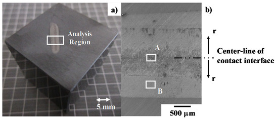 SEM–EDX was first employed to describe the contact interface conditions between the SiC coating and the titanium wire after continuously forging up to the reduction in thickness by 70% in twenty shots. Figure 8 depicts the optical microscopy and SEM images on the contact interface. As had been reported in [12,14], this contact interface consists of two regions in Figure 8a; e.g., a black zone at the center of the contact interface and white zones sandwitching this black zone.