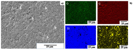 SEM–EDX analyses were first utilized to describe the microstructure and element mapping of the A-region in Figure 8b. As shown in Figure 9a, the microstructure of black zone at the center of A-region consists of two zones; e.g., black a-zone and gray b-zone. Element mapping of the same analysis region as seen in Figure 9a, was depicted in Figure 9b. The a-zone in Figure 9a is an agglomerate with high carbon contents on the SiC coating surface. Since the titanium and oxygen maps are coincident with each other at b-zones, this b-zone is a titanium oxide layer also on the SiC coating. Since no overlapping was detected between carbon and titanium maps, these a and b-zones are exclusively formed on the contact interface of the SiC coating punch surface. The black zone consists of the titanium oxide films and the carbon agglomerates.