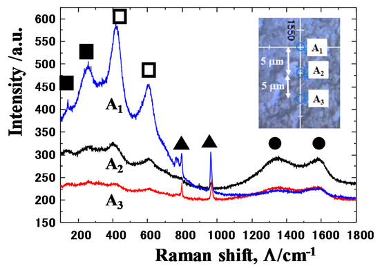Raman spectroscopy was employed to locally characterize the carbon agglomerates as well as the titanium oxide thin films on the contact interface. Figure 11 shows the Raman spectra measured by wide scanning at the A-region of contact interface between β-SiC coating and titanium work. Three positions (A1, A2, and A3) were selected for Raman spectroscopy analysis; e.g., A1 was located in the b-zone in Figure 9a, A2, in the a-zone and A3, near the b-zone. The distance among A1–A3 was constant by 5 βm. As in the literature [15,16,17,18], and the previous study in [14], two broad D and G-peaks are detected at the Raman shift of Λ = 1300 cm−1 and 1600 cm−1, respectively. This proves that a-zones in Figure 9 are not titanium or silicon carbides but they are agglomerates of free or unbound carbon. That is, free carbon is present at the center of the contact interface in correspondence to high carbon agglomerates in Figure 9b.