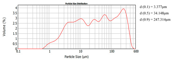 Moreover, the particle size distribution (Malvern 2000, Mastersizer, Thessaloniki, Greece) depicted that the particles of 2–500 μm size prevailed in the binder’s mass (Figure 1). The above analysis indicated the high volumetric percentage of silt contained in the soil (2–63 μm) of approximately 56%, with a 31% being fine sand (63–250 μm) and 13% clay particles (<2 μm). Atterberg limits were estimated (ASTM-D4318-00), while the Plasticity Index of the soil was calculated at 23.2. The liquid limit was calculated at 47.2% and the plastic limit at 24%. Thus, using the plasticity chart by Casagrande (ASTM-D2487-17) [31], the soil was classified as lean clay (CL).