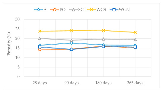 The porosity results signify the porous structure of the WGS mortars since the porosity values were the highest recorded compared to the other mortars at all ages (Table 2, Figure 4). For PO and WGN mortars, it is noted that the porosity values remained relatively low, with the annual results being close to the values of the untreated mortar A. These values indicate the compact structure of these specimens. The high porosity values of WGS mortars, agree with the high absorption rate through capillary, while the values of the SC mortars reveal a porous structure. The high porosity values justify the low values of drying index at all ages for mortars SC and WGS.