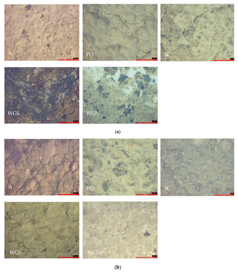Moreover, the color alteration was apparent in WGS mortar, while in SC, some coloring spots were detected (Figure 7a). Both WGS and WGN mortars developed tarnishes and white agglomeration spots. The least porous mortar PO presented an excellent behavior in freeze–thaw cycles without showing any significant reduction in compressive strength after the completion of the cycles. The low porosity indicates a more stable mass, justifying the high values of compressive strength. The low porosity of the WGN mortar, however, is not consistent with higher strength development, presenting moderate mechanical characteristics after the freeze–thaw cycling.