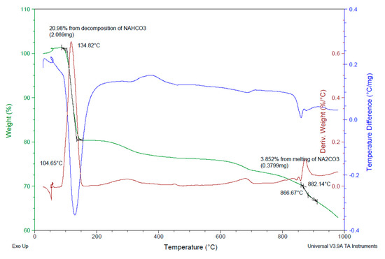 To determine the nature of the efflorescence of WGN mortars, differential thermal, and thermogravimetric analysis (DTA/TG) was performed through a TA Instruments SDT 2960 analyzer (Thessaloniki Greece) (Figure 8). The results indicated the presence of sodium hydrogen carbonate (NaHCO3) and sodium carbonate (Na2CO3) [46].