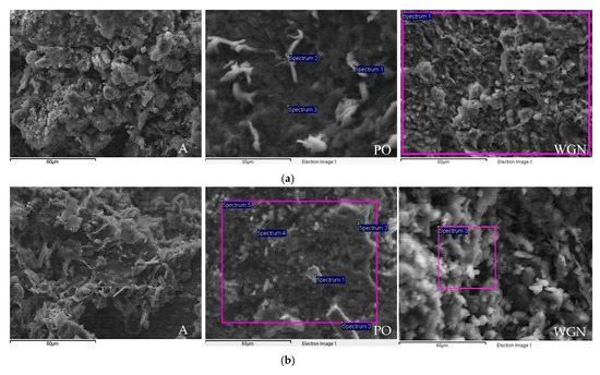 SEM images of the mortars (a) at an early age and (b) at 365 days (scale: 60 μm for A, 60 and 30 μm for PO, and 60 and 40 μm for WGN mortars).