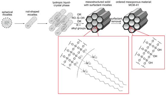The sol–gel chemistry behind an MSN formation is complex, relying on the use of surfactant templates to introduce porosity. A typical scheme for the synthesis of MCM-41 is shown in Figure 1.
