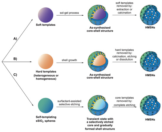 The former refers to MSNs composed of an interior void space with penetrating channels integrated into the silica shell. There are some important features of HMSNs: (i) the interstitial hollow space is able to act as a reservoir, (ii) guest molecules are free to diffuse in/out of the silica shell through the pore channels and (iii) it is easy to chemically modify the exterior silica surface (via abundant silanol groups). These features mean HMSNs represent ideal candidates for both the loading and delivery of chemical agents (e.g., carbon dots, organic dyes, fluorine compounds, etc.) [41,42,43]. HMSNs can be produced by several different methods—“soft-templating”, “hard-templating” and “self-templating” [44,45]—as illustrated by Figure 2.