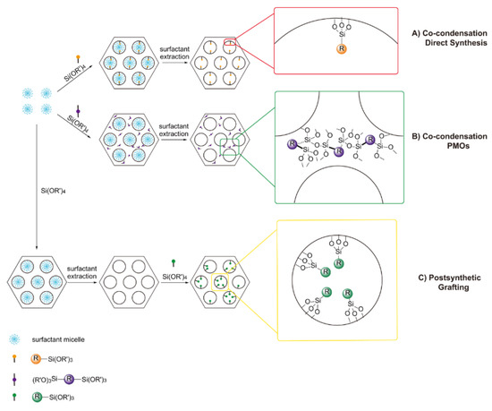 There are two nanoparticulate platforms that can be produced by the co-condensation method: direct synthetic (also called one-pot) organically functionalised MSNs and periodic mesoporous organosilicas (PMOs). One-pot synthesis usually involves the use of terminal trialkoxyorganosilanes R-Si(OR’)3, tetraalkyl orthosilicates Si(OR’)4 with an SDA (e.g., cetyltrimethylammonium bromide). On the other hand, if R-Si(OR’)3 is substituted by the bridged organosilane precursor (OR’)3-Si-(OR’)3, homogenous hybrid organic–inorganic MSNs, where organic units are covalently incorporated within the three-dimensional silica matrix (more specifically, homogenously distributed in the pore walls), are produced. This material is known as periodic mesoporous organosilica (PMO) and exhibits some advantages compared to conventional MSNs, namely a high loading capacity and a uniform distribution of organic groups within the framework [67]. PMOs have shown a great potential in many applications such as optics [68], catalysis [69] and adsorption studies [70]. Figure 4 is a schematic summary of the post synthetic grafting process as well as both co-condensation methodologies.