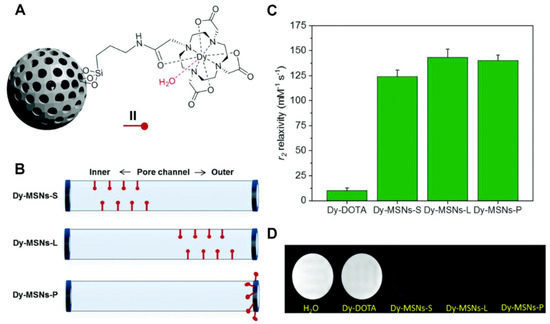 MSNs capable of shortening longitudinal relaxation rates can be produced by simply incorporating a paramagnetic ion within the silica architecture. Seminal work by Taylor et al. used this strategy to functionalise the MCM-41 material with Gd-Si-DTTA through siloxane linkers integrated within the silica nanoparticles [74]. This produced the first example of MRI-active MSNs with r1 = 28.8 mM−1 s−1 at 3 T, a scaffold that has since been adopted and modified by many groups, with T1 relaxivities of up to 33.57 ± 1.29 mM−1 s−1 at 7 T recorded for this platform. Our understanding of the operational principles has led to an appreciation of the importance of the location of the paramagnetic chelate in image contrast [75]. Magnetic resonance (MR) contrast generation can also be provided by alternative means through the integration of nanoparticles within the MSN architecture. This includes synthesis of MSNs with a core/shell architecture where the core is magnetically active e.g., SPION/MSN core/shell systems [76]. Alternatively, nanocomposites such as metal oxides can be confined to the pore channel of the MSN, with this reported by Ni et al. where gadolinium oxide loaded within the pores displayed effective T1 contrast capabilities [77]. While Gd3+ and Mn2+ promote positive contrast within the MRI scan, T2-active MSNs can be produced through the introduction of paramagnetic ions with anisotropic ground states, exhibiting short electronic relaxation times such as Dy3+ [78,79]. This has been recently reported by our group where Dy-DOTA complexes were covalently coupled through amino anchor points to generate Dy-MSNs with an effective transverse relaxation rate r2 = 143.5 ± 8.2 mM−1 s−1 at 11.7 T when Dy-DOTA resided in the outer pore channel of the particles (Figure 5) [80].