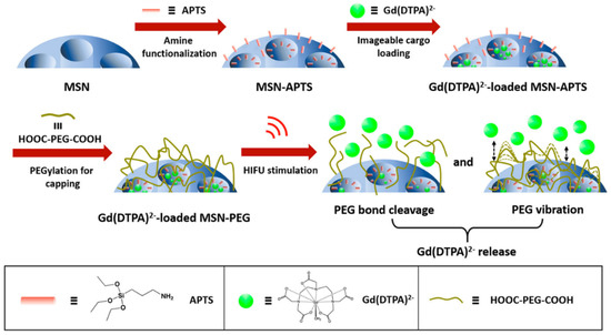 A schematic representation of high-intensity focused ultrasound (HIFU)-responsive magnetic resonance imaging (MRI)-active MSNs. In this work, the particles were initially amine Figure 2. (green) and the pore channels capped with poly(ethylene glycol) (PEG) (brown). Finally, the effect of HIFU stimulation on the release of Gd(DTPA)2− can be observed. Reprinted with permission from reference [94]. Copyright (2019) American Chemical Society.