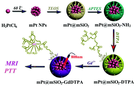 - Zhao, L.; Ge, X.; Yan, G.; Wang, X.; Hu, P.; Shi, L.; Wolfbeis, O.S.; Zhang, H.; Sun, L. Double-mesoporous core–shell nanosystems based on platinum nanoparticles functionalized with lanthanide complexes for in vivo magnetic resonance imaging and photothermal therapy. Nanoscale 2017, 9, 16012–16023. [Google Scholar] [CrossRef] [PubMed]