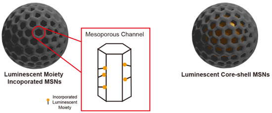 Schematic illustration of two types of MSNs as applied in optical imaging where a luminescent moiety is incorporated into the MSNs substructure (Section 4.1) or is confined within an MSN-wrapped luminescent core (Section 4.2).