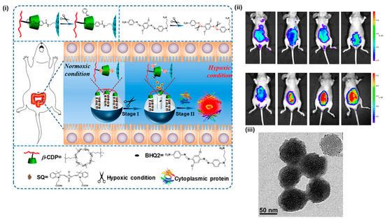 HCFA-MSNs. (i) A schematic illustration of hypoxia-activatable and cytoplasmic protein-powered fluorescence cascade amplifying (HCFA) MSNs. The HCFA-MSNs are composed of the β-cyclodextrin polymer (β-CDP) gatekeeper, loaded with both squarylium (SQ) dyes and black hole quencher 2 (BHQ2). (ii) In vivo fluorescence images of nude mice after the injection of a commercial small molecular fluorescent probe, the HCFA-MSNs, the control group or convalescent group of the HCFA-MSNs (from right to left), respectively. The most intense fluorescent signal can be observed the HCFA-MSNs. (iii) TEM image of the as-synthesised MSNs. Adapted with permission from Ref. [124]. Copyright (2020) American Chemical Society.
