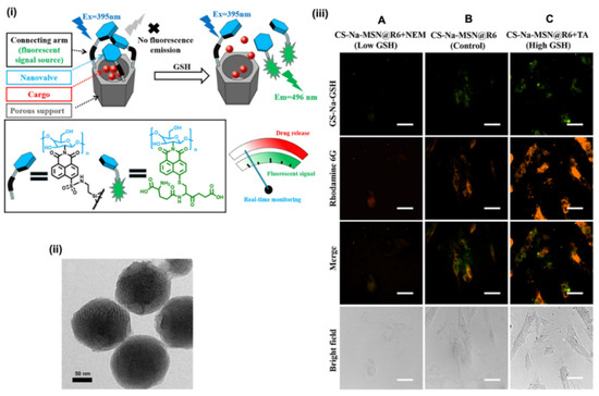 Chitosan-gated fluorescent mesoporous silica nanoparticles (FMSNs). (i) Schematic illustration of the design of chitosan-gated MSNs for monitoring drug release in vitro. The as-synthesised nanoparticles are composed of naphthalimide-dye-functionalised chitosan (Cs-Nac) as the gatekeeper, an MSN nanoparticulate scaffold and Rhodamine 6G (R6) as the model cargo agent. On glutathione (GSH) addition two fluorescent emissions corresponding to the release of R6 and cleaved Cs-Nac are observed. (ii) A TEM image of as-synthesised MSNs. (iii) Fluorescence images of MRC–5 cells with different GSH concentration. (A) The as-synthesised MSNs with low GSH concentration. (B) MSNs in MRC-5 without any other treatment. (C) MSNs with high GSH concentration. Adapted with permission from reference [126]. Copyright (2020) American Chemical Society.