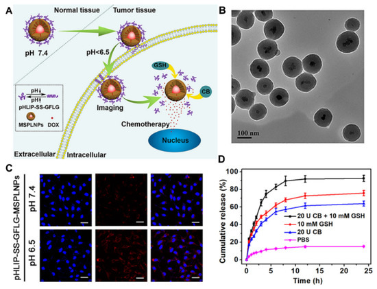 In this example, ZGGO@mSiO2 nanoparticles were coated with a polypeptide which is composed of a part of a pH-low-insertion peptide (pHLIP) and a part of a GFLG peptide with the linkage of a disulphide bond (pHLIP-SS-GFLG). This system was subsequently loaded with anticancer drug DOX. The particles were observed to exhibit the strongest cellular (A549 cells and HepG2 cells) luminescence intensity under acidic conditions (pH 6.5) compared to physiological pH (pH 7.4), an observation assigned to a triggered conformational change in the peptide, facilitating its membrane insertion. At the same time, in vitro drug release was demonstrated in a buffer solution containing glutathione (GSH) and/or cathepsin B (CB), with the highest release observed when both were present.