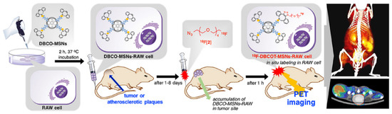 A schematic representation for the design of 18F-radiolabelled MSNs. Cyclooctyne functionalised MSNs (DBCO-MSNs) were first incubated with RAW cells, with the incubated samples then injected into nude mice bearing a tumour or atherosclerosis plaques. One to eight days later, 18F-labelled azide was injected into the mice to visualise the tumour/atherosclerotic sites in vivo. Reprinted with permission from reference [152]. Copyright (2019) Elsevier.