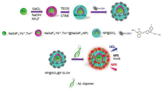 - Wang, C.; Wang, X.; Chan, H.-N.; Liu, G.; Wang, Z.; Li, H.-W.; Wong, M.S. Amyloid-β Oligomer-Targeted Gadolinium-Based NIR/MR Dual-Modal Theranostic Nanoprobe for Alzheimer’s Disease. Adv. Funct. Mater. 2020, 30, 1909529. [Google Scholar] [CrossRef]
