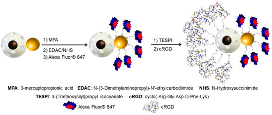 More specifically, a PEGylated MSNs surface was functionalised with cyclooctyne, generated and intravenously injected into the mouse, with the 18F-labelled azide species then injected to couple with the functionalised MSNs a few days later. With the help of the SPAAC reaction, the accumulation of radiolabelled nanoparticles in vivo was shown, with tumour and atherosclerotic sites thereby visualised through PET imaging. More recently, 68Ga (T1/2 = 68 min)-labelled MSNs have been reported by Jung et al. to serve as a PET imaging probe [153]. Radioactive 68Ga was physically loaded within the silica matrix by a chelator-free labelling method, enabling the conjugation of the radiotracer to the MSNs in less than 20 min.