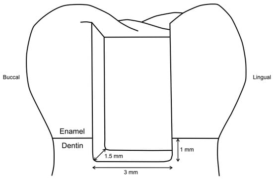 After cleaning the teeth of plaque, gingival tissue, and calculus, standardized Class II cavities were prepared mesially and distally in each tooth, using a high-speed contra-angle handpiece (Sirius, Micro-Mega, Besançon Cedex, France) rotating at 180,000 rpm. The dimensions of the cavities were 3 mm in width and 1.5 mm in depth, with cervical margins 1 mm below the cementoenamel junction in dentin (Figure 1), as checked with a periodontal probe. Preparation was performed using 80 μm cylindrical diamond burs (Universal Prep Set, Intensiv, Grancia, Switzerland). Enamel margins were beveled with 40 μm flame-shaped diamond burs (Intensiv). All burs were exchanged after they had been used for the preparation of four cavities.