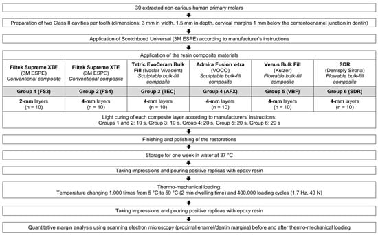 Transparent matrices (Lucifix Matrix System, Kerr, Orange, CA, USA) were adapted around each tooth. Thereafter, all specimens were treated with a universal adhesive (Scotchbond Universal, 3M ESPE, St. Paul, MN, USA, LOT: 80426B) applied in self-etch mode according to the manufacturer’s instructions, by rubbing in for 20 s, gently air drying for 5 s, and light curing for 10 s at 1200 mW/cm2 with an LED curing unit (Bluephase G2, Ivoclar Vivadent, Schaan, Liechtenstein). The cavities (n = 10 per group) were then restored according to their experimental group, as detailed in Figure 2.