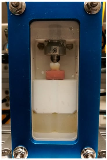 After a one-week storage in water at 37 °C in the dark, the restored primary teeth were subjected to thermo-mechanical loading in a computer-controlled masticator (CoCoM 2, PPK, Zurich, Switzerland) (Figure 3) [,,]. Thermocycling was carried out in flushing water, with 1000 temperature changes from 5 °C to 50 °C (2 min dwelling time). Mechanical stress was applied simultaneously, with a total of 400,000 loading cycles at 1.7 Hz and a load force of 49 N, using standardized metal balls with a diameter of 1.4 mm as antagonists.
