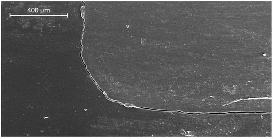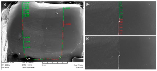 Before and after thermo-mechanical loading, impressions of the restorations were obtained using A-silicone (President Light Body, Coltène Whaledent, Altstätten, Switzerland). Thereafter, the impressions were poured out with epoxy resin (Epoxyharz L, R&G Faserverbundwerkstoffe, Waldenbuch, Germany) and glued on aluminum carriers (Cementit universal, Merz&Benteli, Niederwangen, Switzerland). After sputter coating the positive replicas with gold (Sputter SCD 030, Balzers Union, Balzers, Liechtenstein), they were subjected to a quantitative margin analysis using a scanning electron microscope (SEM) (Amray 1810/T, Amray, Bedford, MA, USA). The tooth–composite interface was classified as continuous, non-continuous, or not judgeable at 20 kV and 200x magnification, both before and after thermo-mechanical loading. The margin integrity was expressed as a percentage of the continuous margins for the total judgeable margin length, and also separately for enamel and dentin margins [,,]. Figure 4 illustrates the method of the performed quantitative margin analysis.