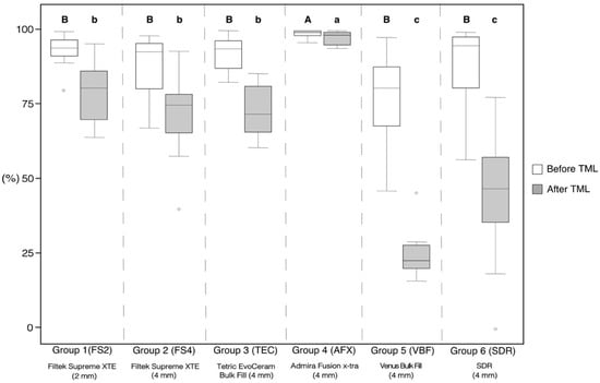 Margin integrity for the total margin length, given as percentages of continuous margins for all experimental groups before and after thermo-mechanical loading (TML). The boxplots represent the medians (black lines) with 25% and 75% quartiles (boxes). The whiskers represent 1.5*IQR (interquartile range), or minima and maxima of the distribution if below 1.5*IQR. Outliers are shown as circles. Statistically significant differences (p < 0.05) in the percentage of continuous margins between different groups are marked with different letters (capital and lower-case letters refer to the situation before and after TML, respectively). All groups showed a significant decline in margin integrity after TML (p < 0.05, respectively).