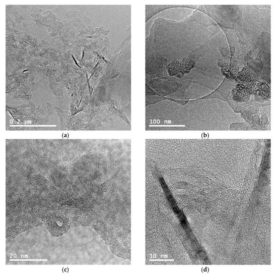To confirm the state of dispersion of nanotubes in the matrix, TEM analysis for nanocomposite with the highest content of the MWCNTs and MWCNT/HNT hybrid system was also carried out. Figure 2 presents the TEM images of nanocomposites containing MWCNTs. Figure 3 and Figure S1 (Supplementary Materials) represent the TEM images of EVA/6 wt.% CNT + HNT hybrid nanocomposite at different magnification. In Figure 3a, it can be seen that the dispersed halloysite nanotubes are relatively short. Probably, some of HNTs broke during compounding. Moreover, in contrast to the SEM observation, on TEM images a few agglomerates of nanotubes can be seen. At the higher magnification on TEM images (Figure 2 and Figure S2), it can be seen that the individual and entangled agglomerates of CNTs were embedded in the EVA matrix.