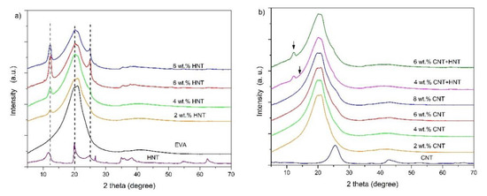 X-ray diffraction patterns of EVA/HNTs (a), EVA/MWCNTs, and MWCNT/HNT hybrid (b) nanocomposites.