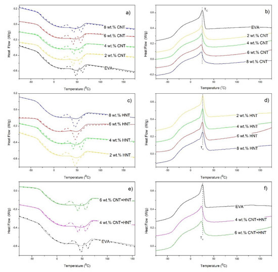 DSC thermograms for EVA/MWCNT nanocomposites (a,b), EVA/HNT nanocomposites (c,d), and hybrid nanocomposites (e,f).